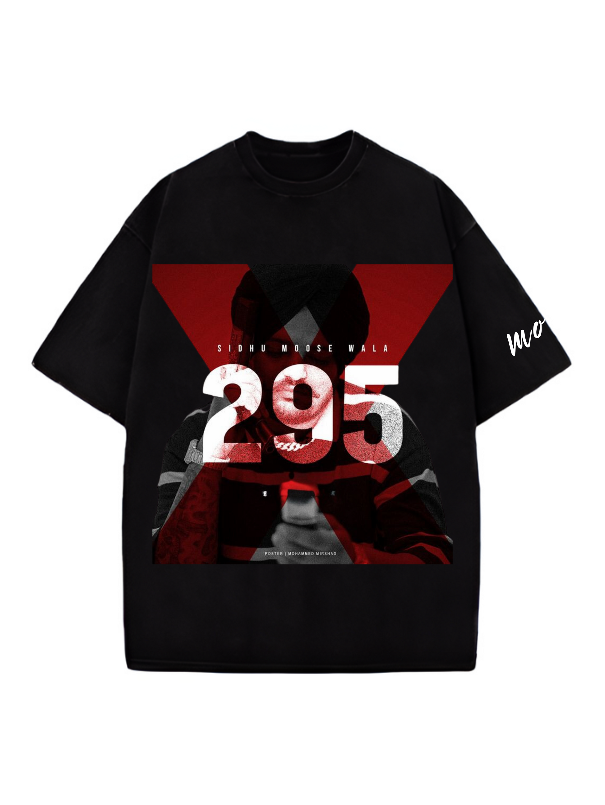 - Central Image: The front of the t-shirt features a striking image of Sidhu Moose Wala, perhaps depicted in a serious or contemplative pose that reflects the weighty themes of the song "295." The design might incorporate elements like the number "295" prominently displayed, possibly in a bold, stencil-like font, symbolizing the legal and societal implications referenced in the song.