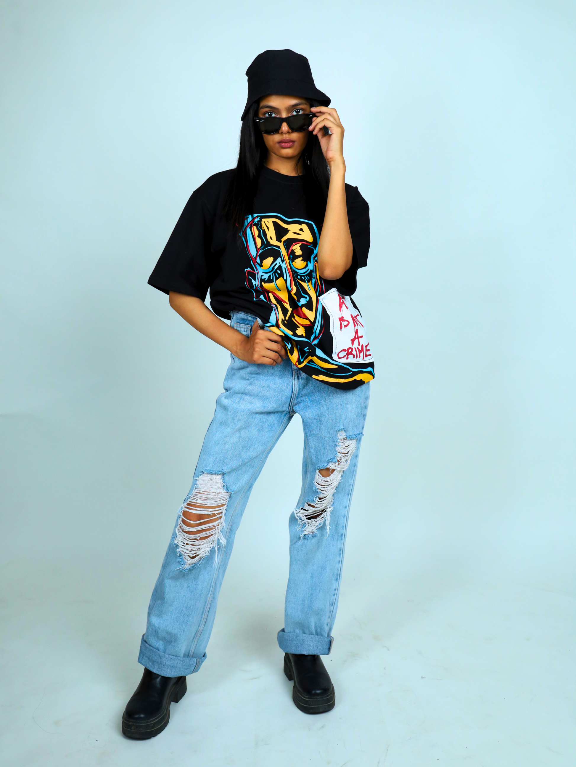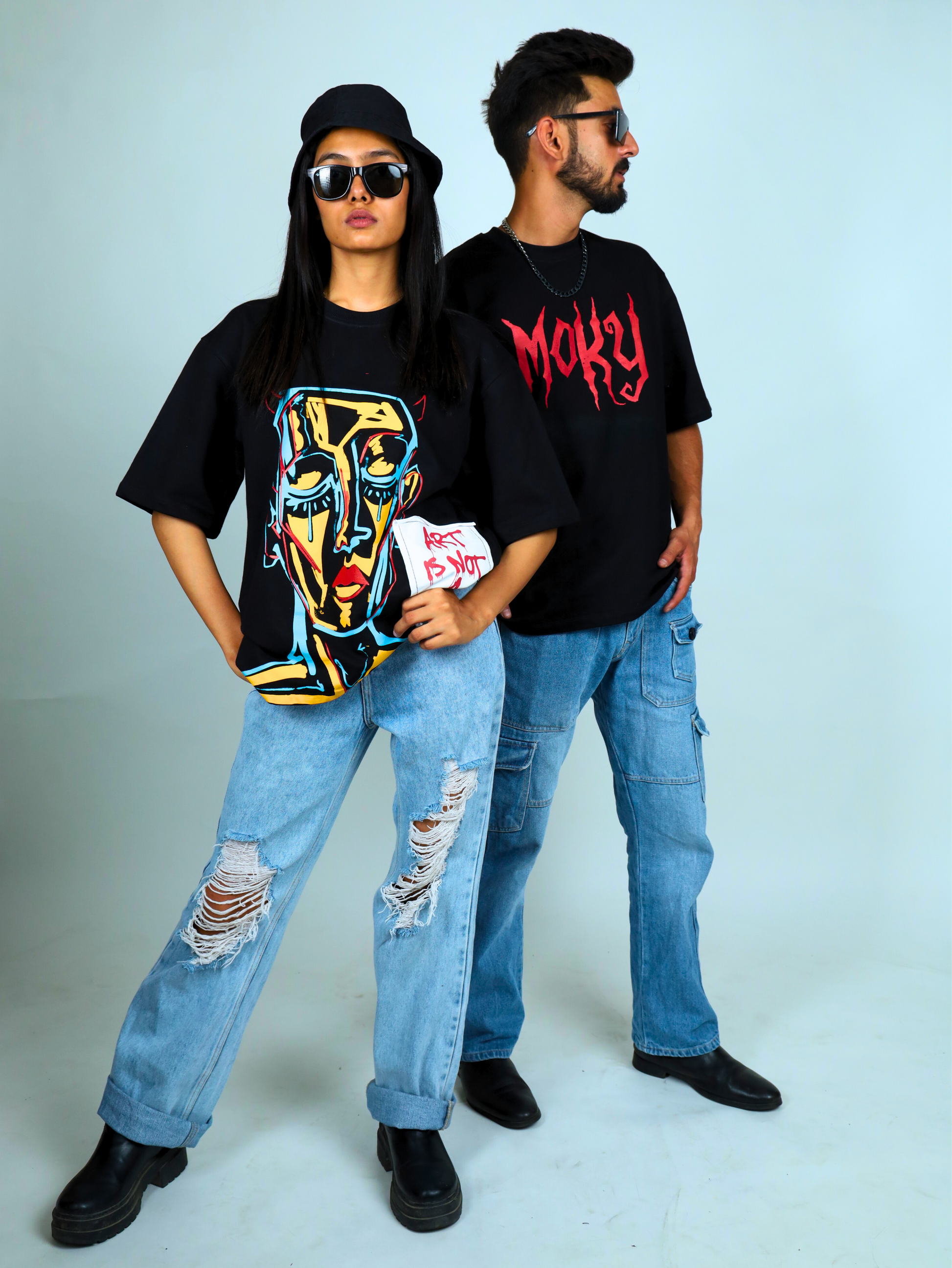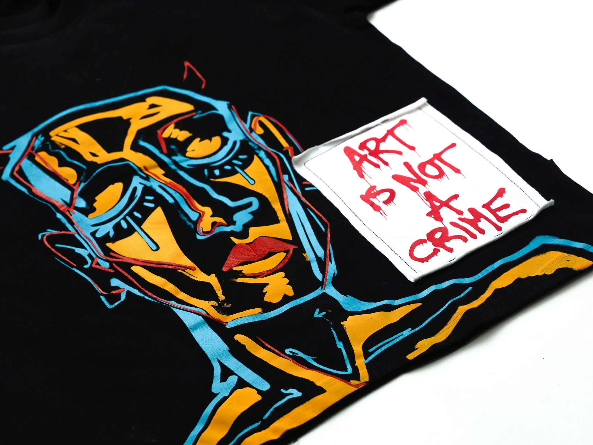- Main Design: The centerpiece of the shirt is an abstract art piece that spans the entire front. The design looks as if it was painted directly onto the fabric, with bold brushstrokes, splatters, and splashes of color creating a dynamic and energetic composition.