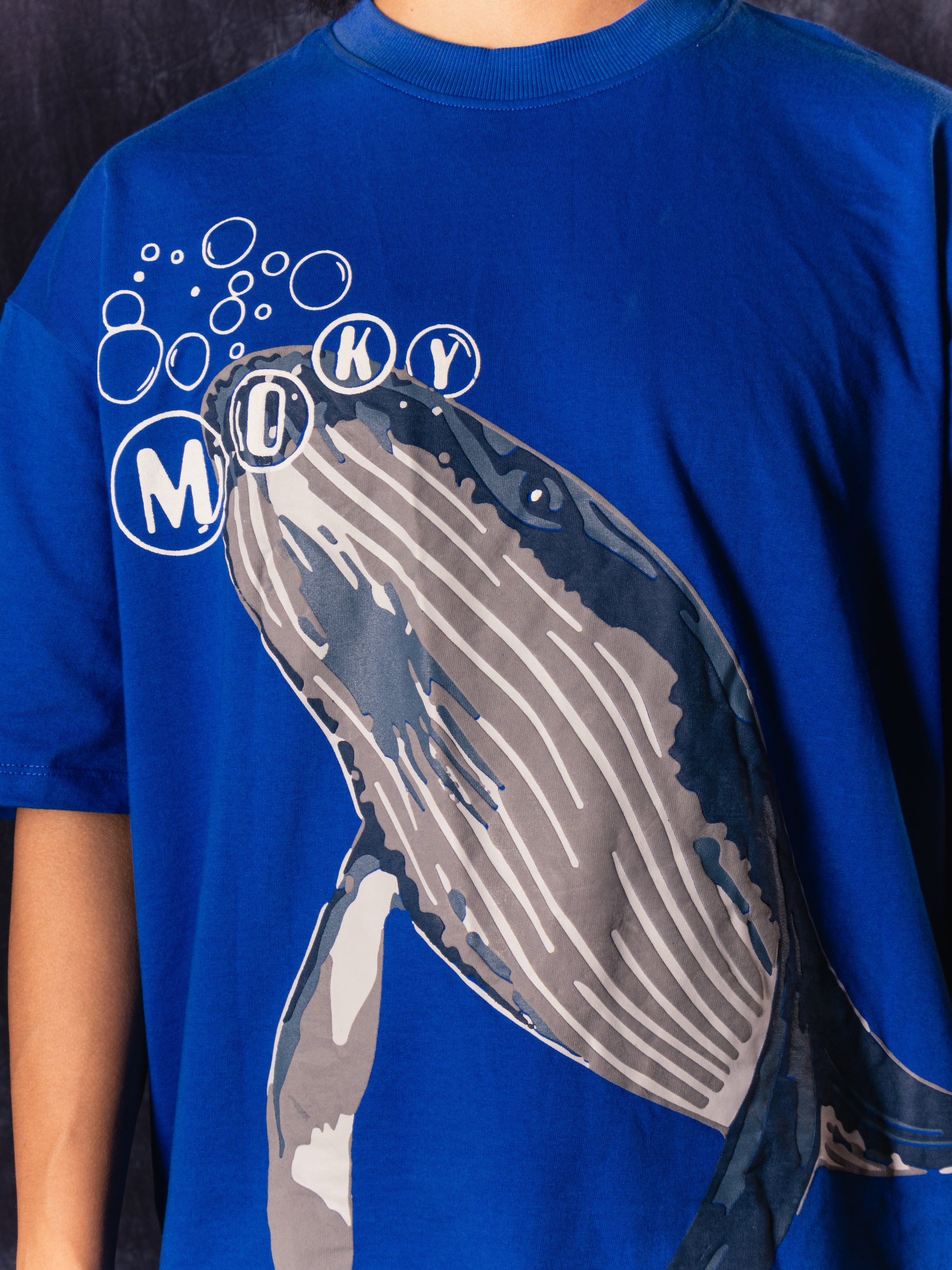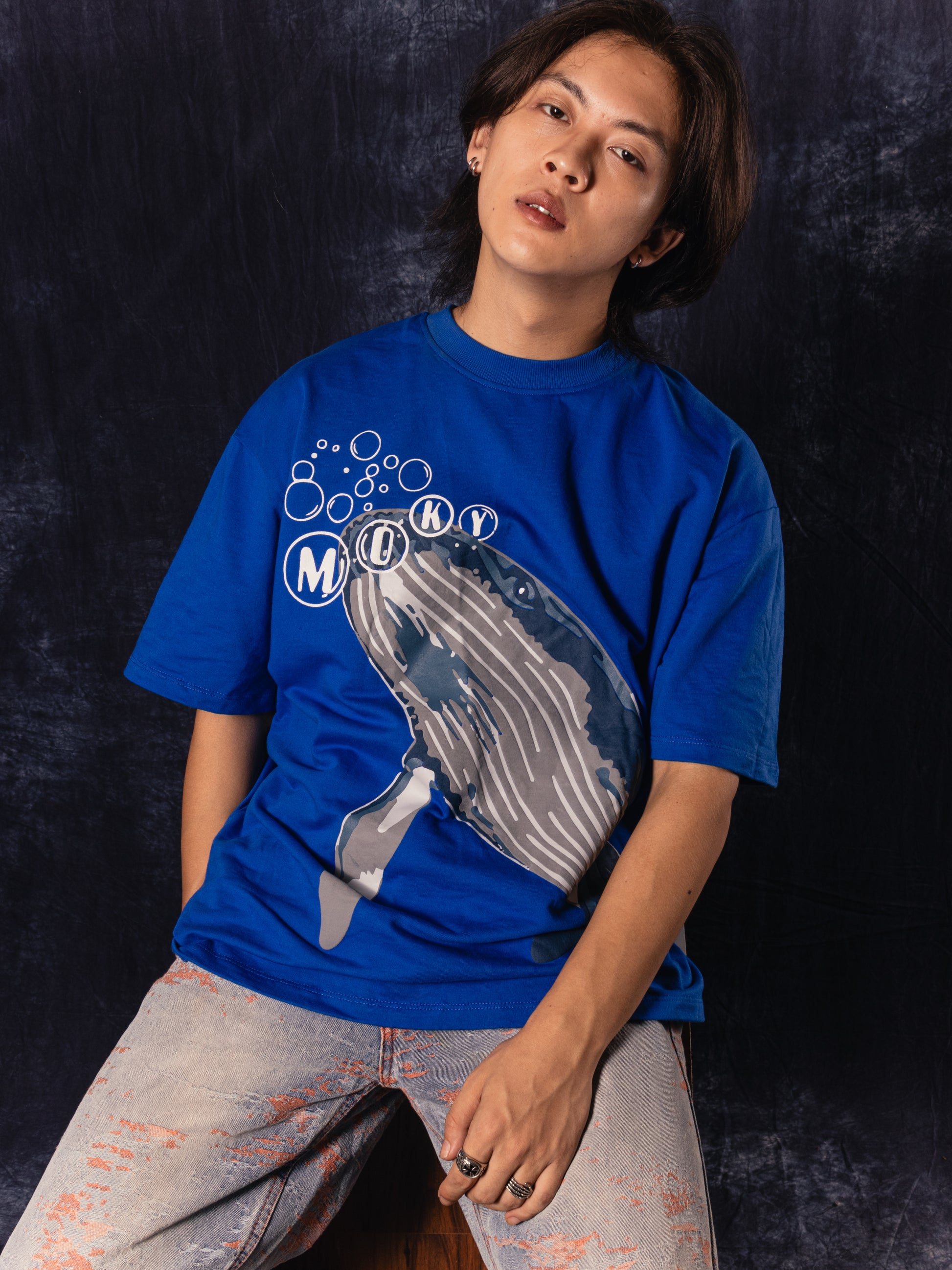 The design captures the essence of depth — a visual nod to freedom and flow. Surrounding the whale, bubble graphics rise toward the neckline, with each bubble encasing the letters of the “Moky” brand name. It's playful, bold, and symbolic — embodying strength beneath the surface.