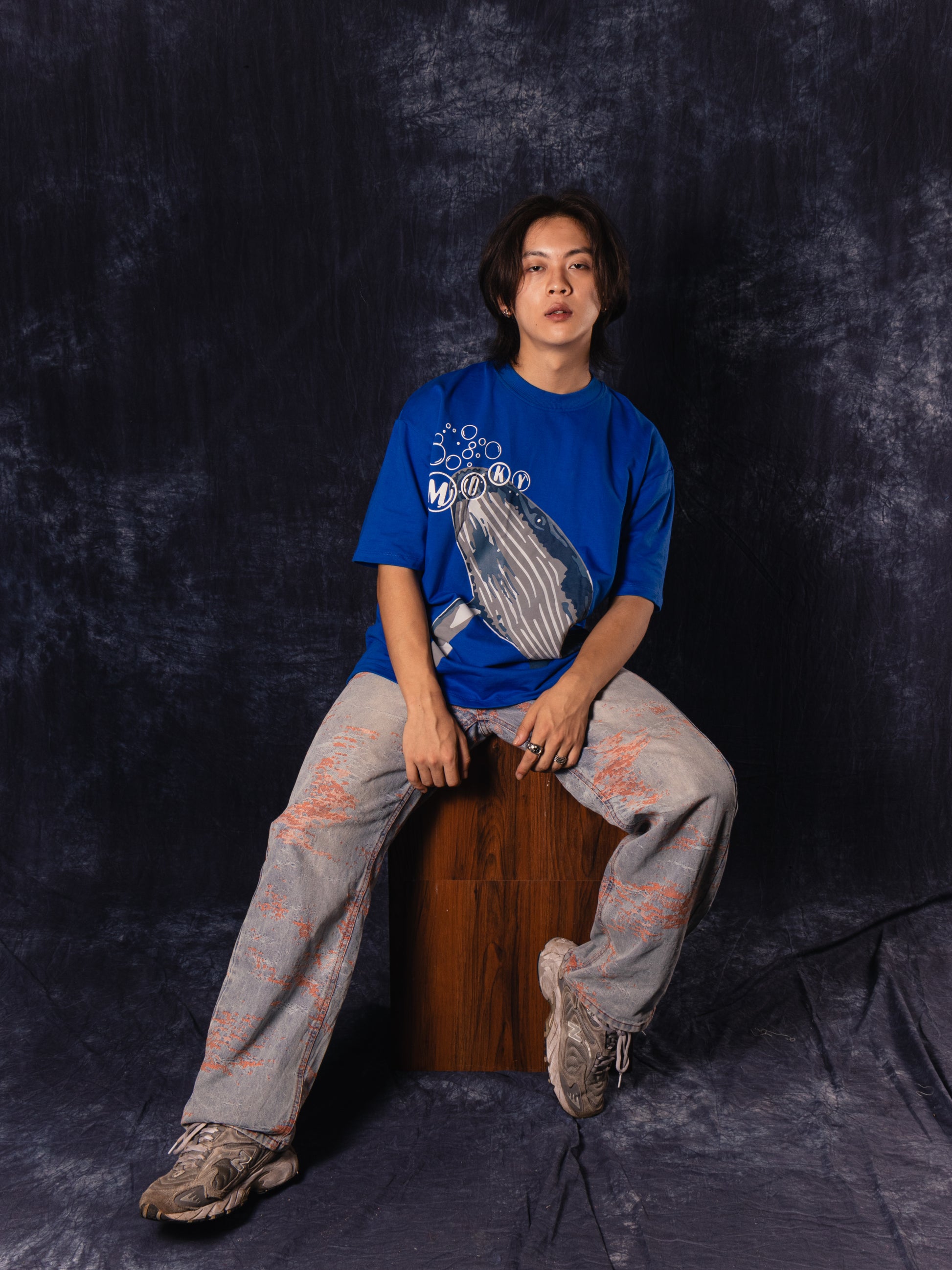 The relaxed drop-shoulder silhouette enhances the oversized vibe, while the rich oceanic blue base sets a standout foundation for the graphic narrative.