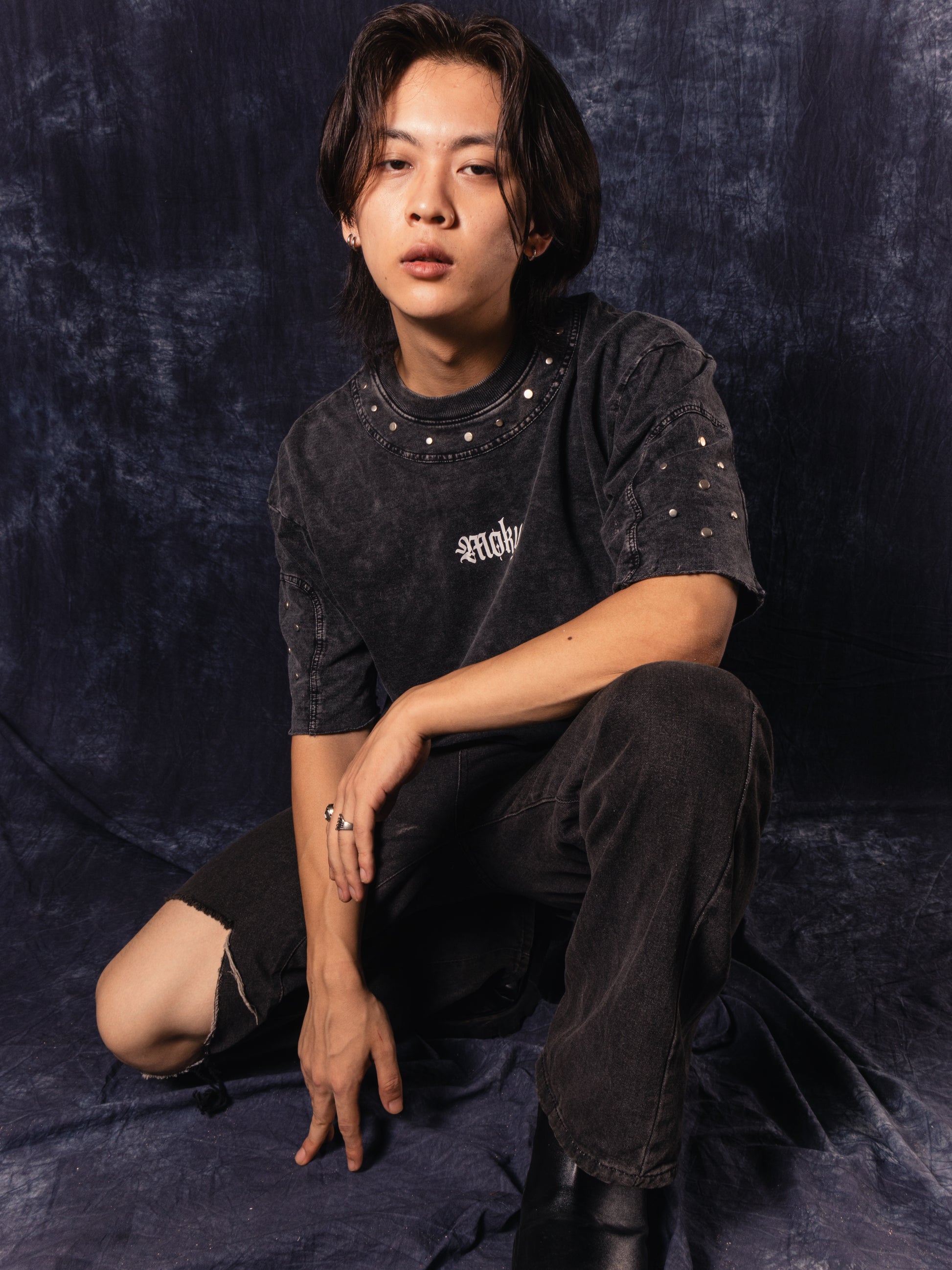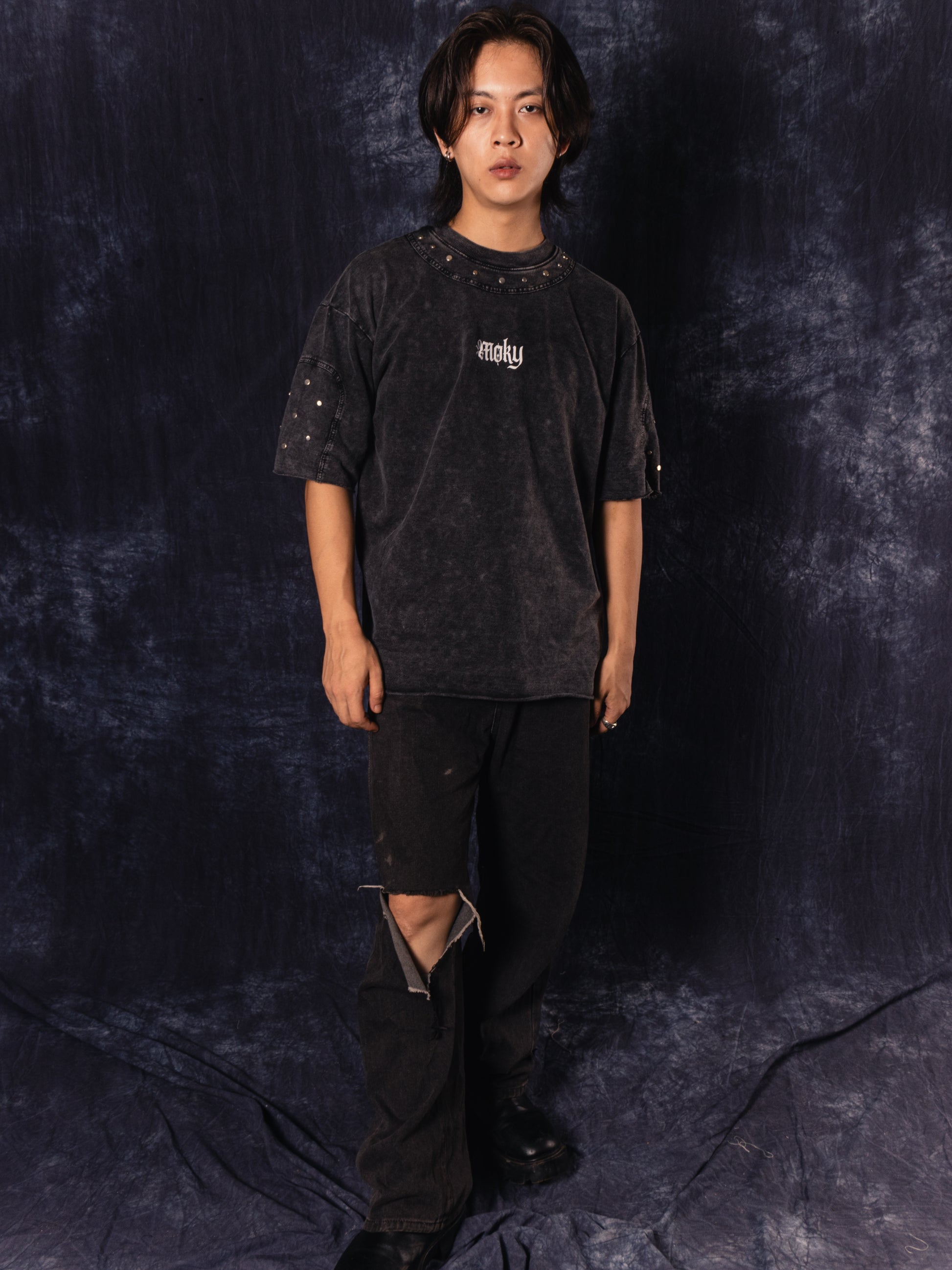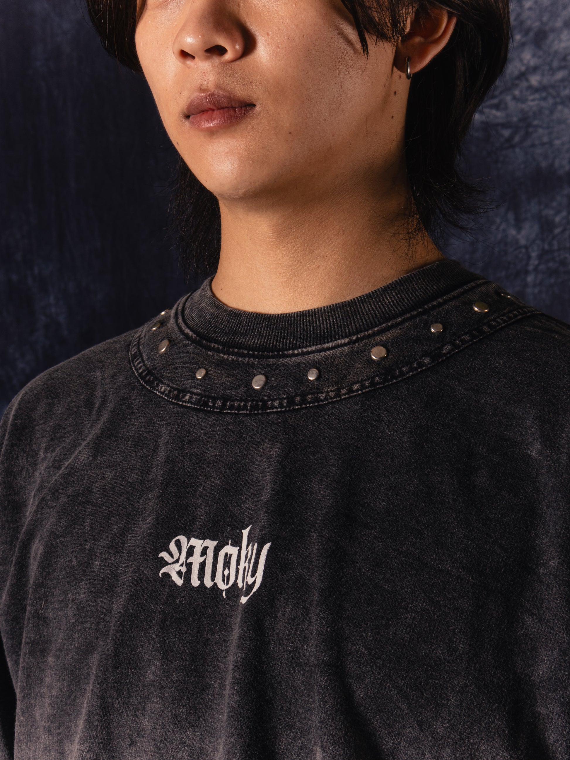 The neckline and sleeves are detailed with metallic studs — subtly placed yet loud enough to turn heads. A gothic "Moky" logo sits at the chest, screen-printed in crisp white to contrast the washed black base. The relaxed drop-shoulder fit emphasizes laid-back confidence, making it an ideal statement piece for streetwear purists.