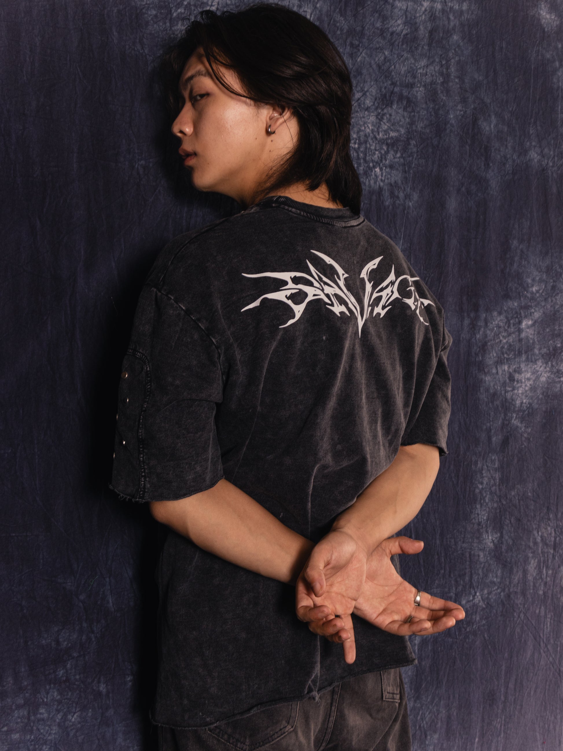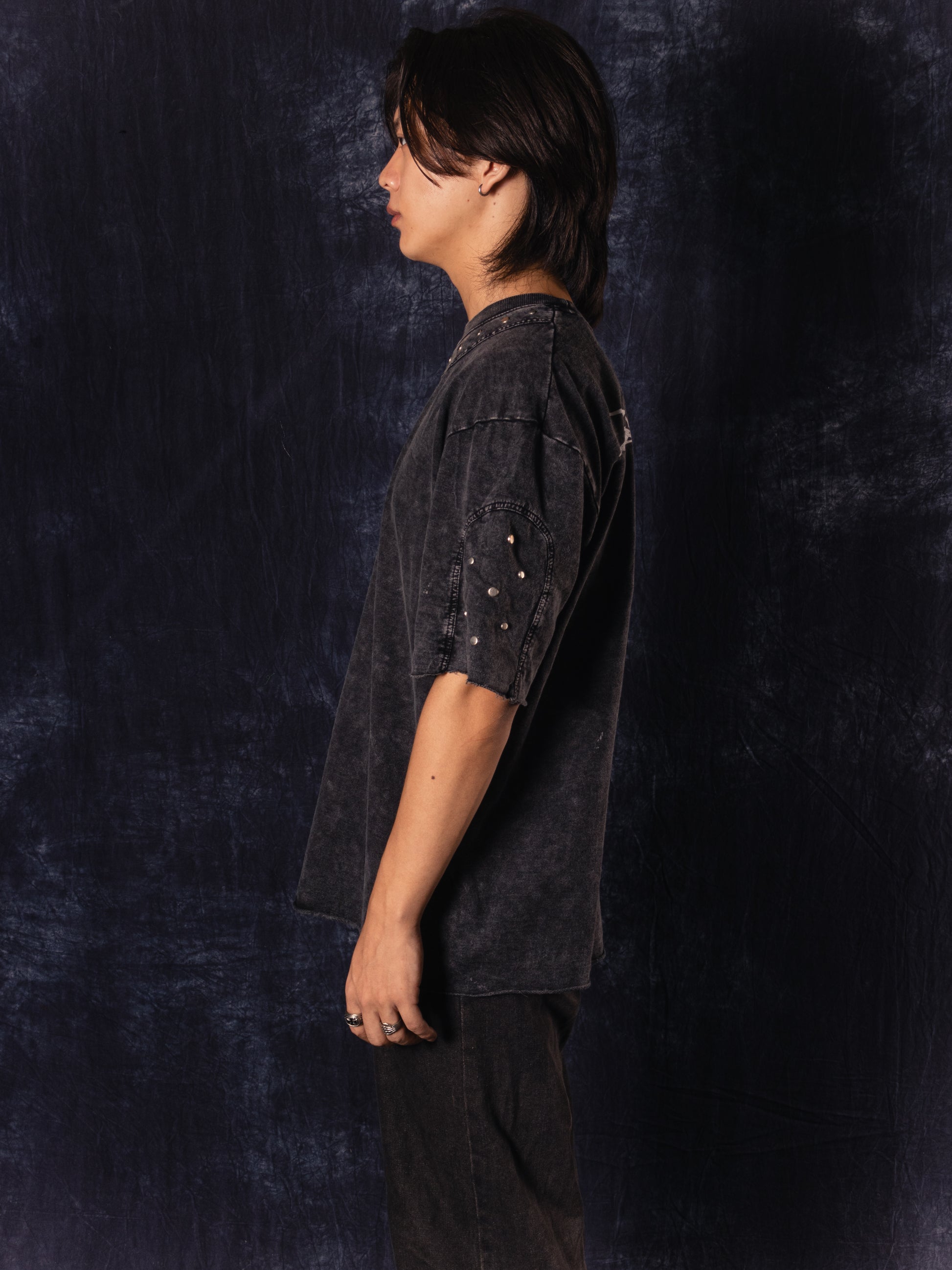 Designed for those who walk the line between rebellion and refinement, this washed black oversized tee brings edge and craftsmanship into perfect sync. Made from 240 GSM heavyweight cotton, the fabric is pigment-dyed and stone-washed for a vintage, grunge-inspired texture that feels broken-in but built to last.