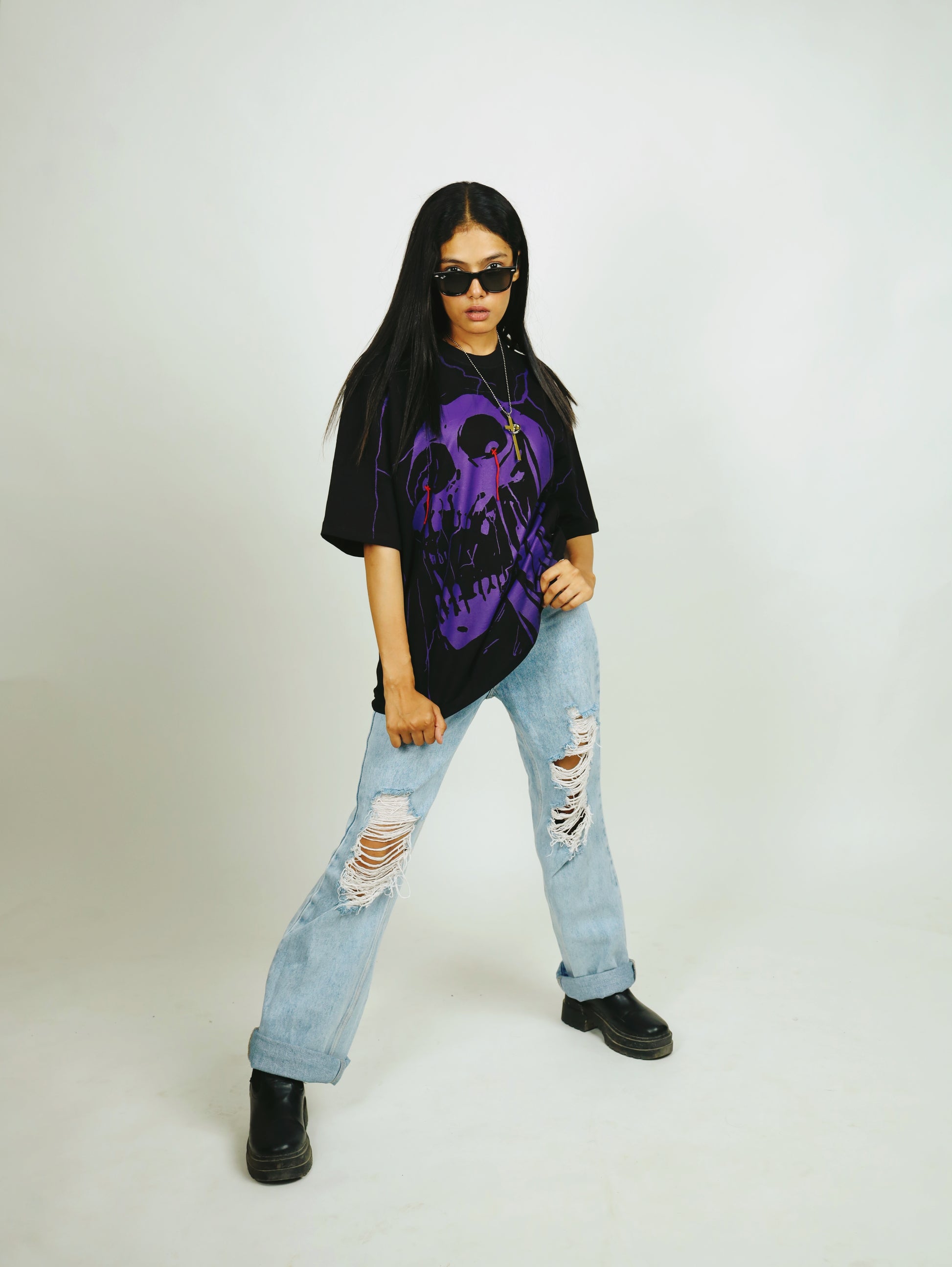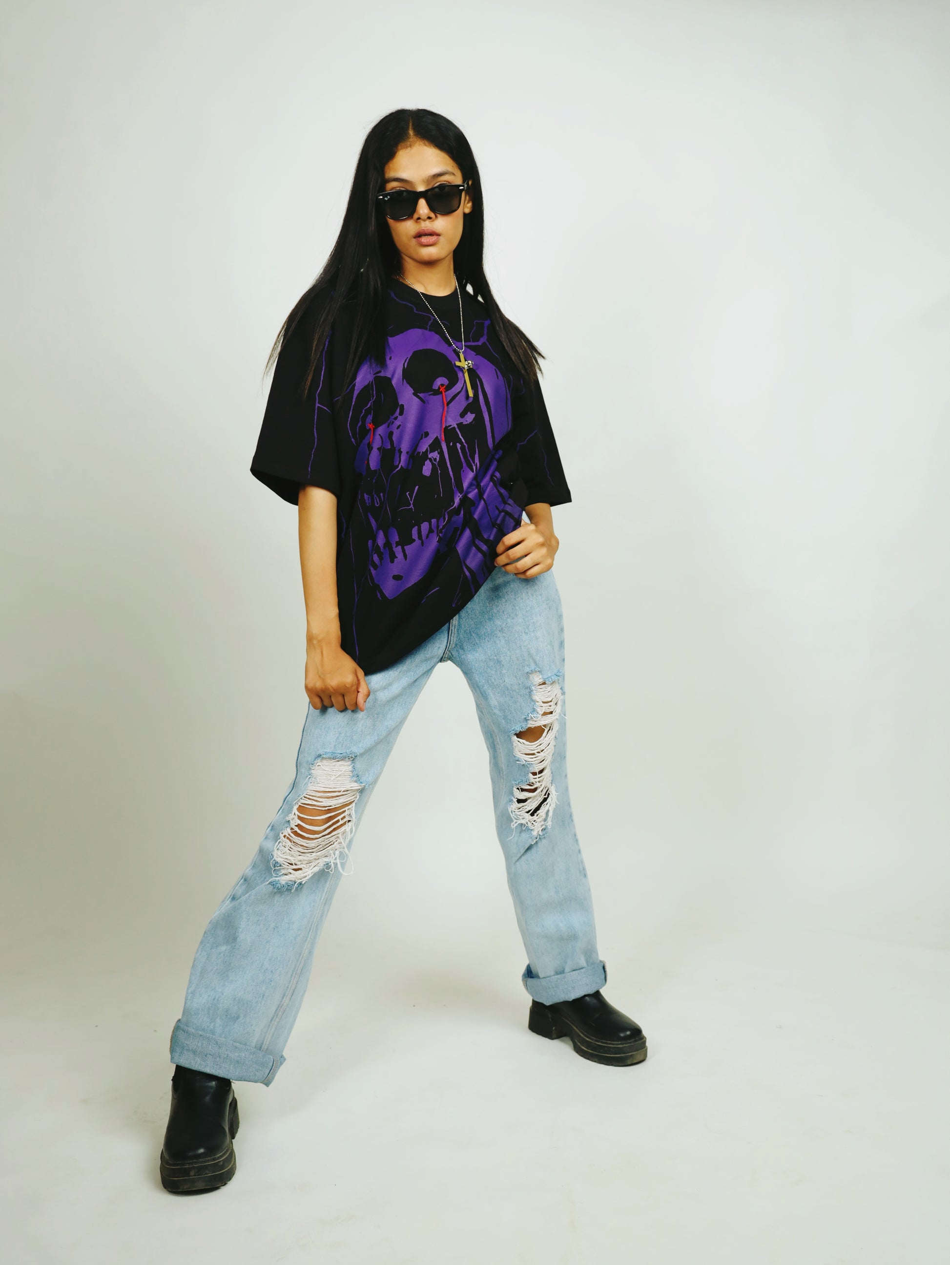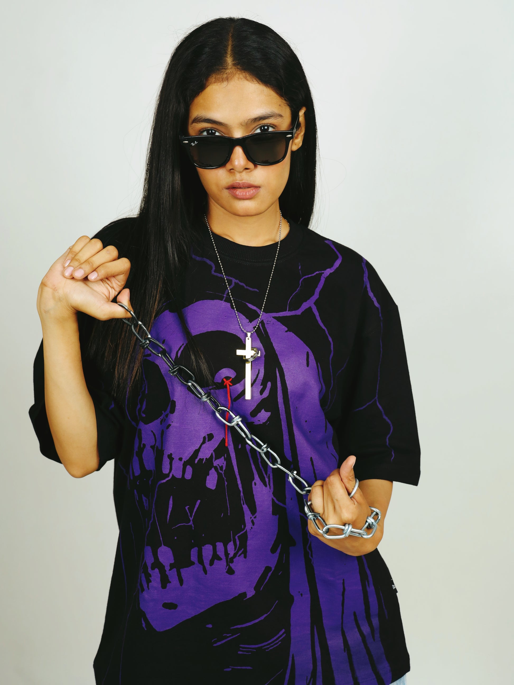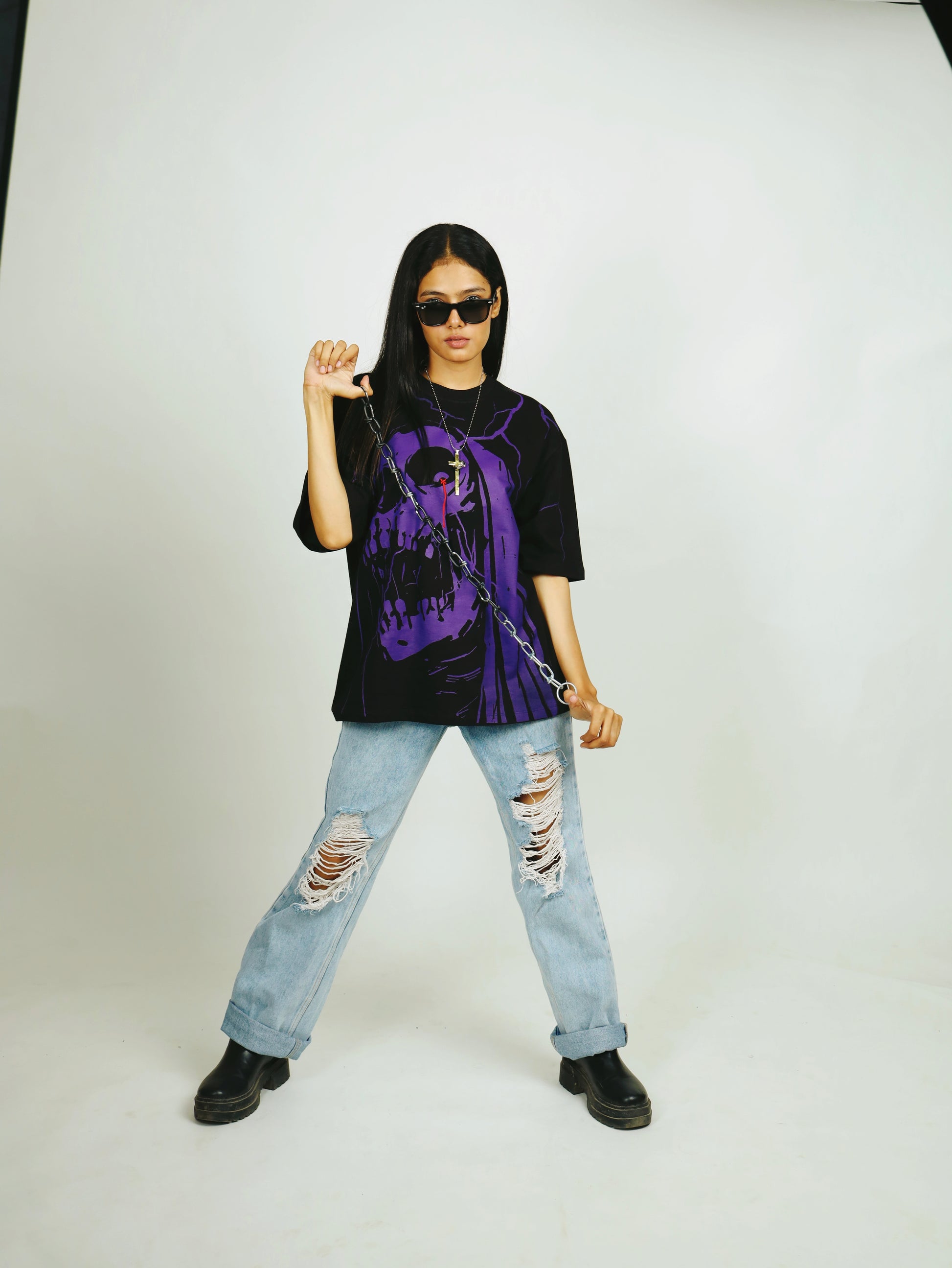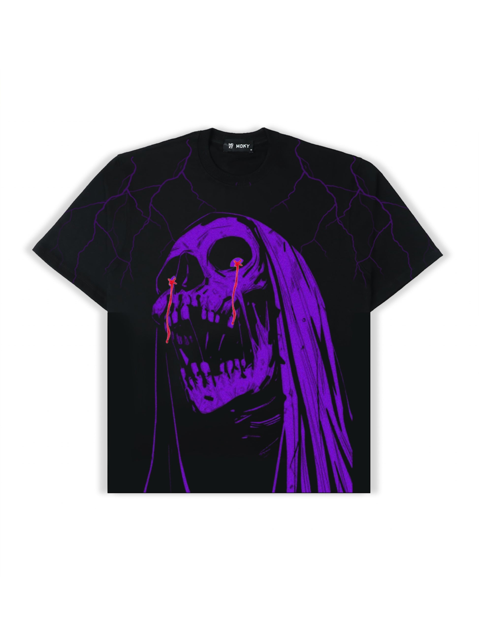 - Main Design: At the center of the T-shirt, a menacing skeleton stands tall, caught in the midst of a fierce storm. The skeleton, detailed with intricate bone structures and hollow eyes, appears to be almost dancing with the wind, giving it an eerie, dynamic presence.
